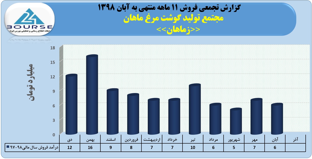 به گزارش کدال نگر بورس ٢۴،شرکت مجتمع تولید گوشت مرغ ماهان در ١١ ماهه منتهی به آبان ١٣٩٨ حدود ٩٢ میلیارد تومان فروش داشته است که حدود ۶ میلیارد تومان متعلق به آبان می باشد.