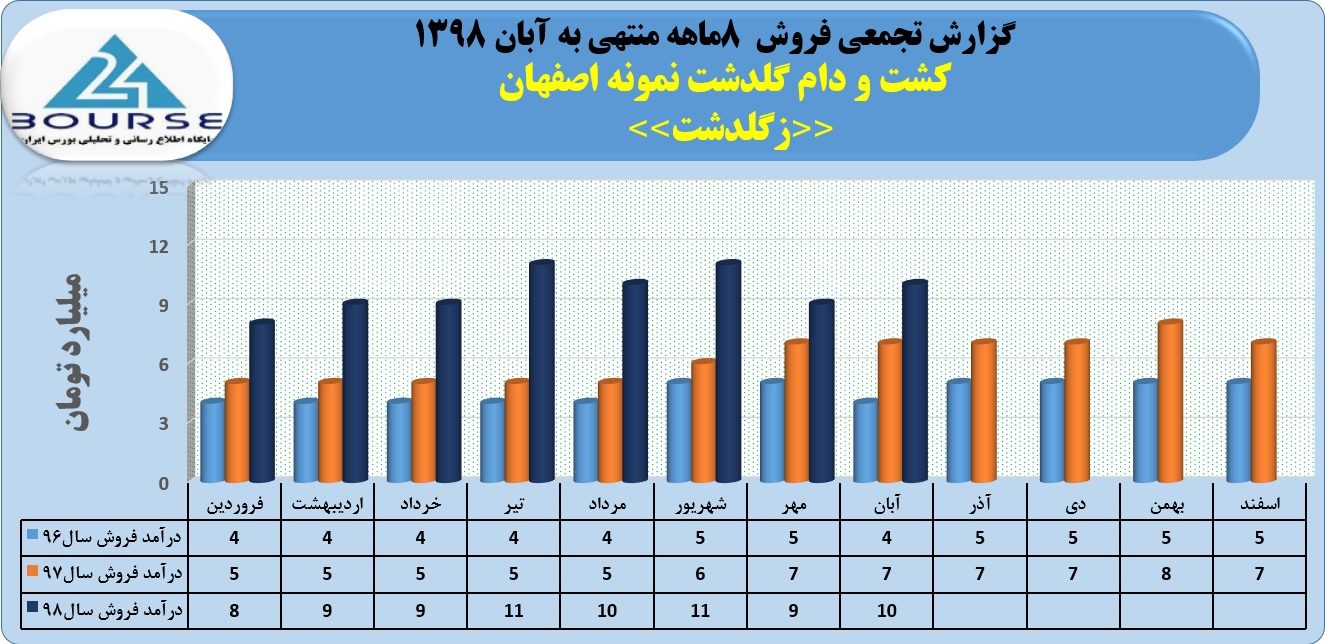به گزارش کدال نگر بورس ٢۴،شرکت کشت و دام گلدشت نمونه اصفهان در ٨ ماهه منتهی به آبان ١٣٩٨ حدود ٧۶ میلیارد تومان فروش داشته است که حدود ١٠ میلیارد تومان مربوط به آبان می باشد.