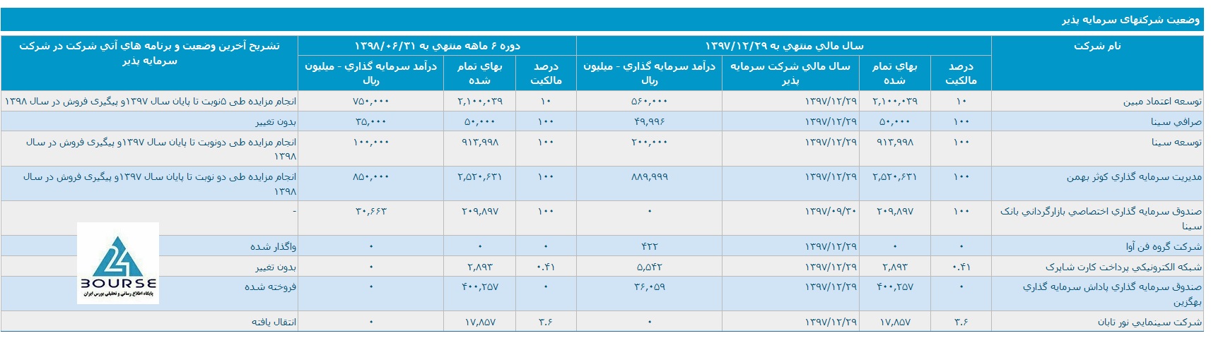 در سرفصل سرمایه گذاری ها بانک خبر از تداوم پیگیری فروش سهام سه شرکت توسعه اعتماد مبین و توسعه سینا و کوثر بهمن را داده است که فروش هر یک از این شرکت ها تحولات خوبی در سود بانک سینا به وجود خواهد آورد.