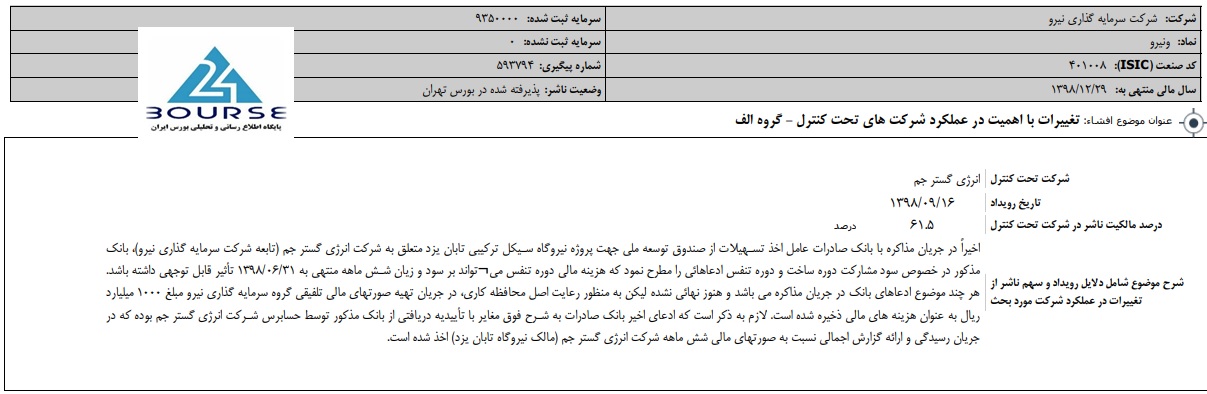 به گزارش کدال نگر بورس٢۴،شرکت سرمایه گذاری نیرو اعلام نمود،در جریان مذاکره با بانک صادرات عامل اخذ تسهیلات از صندوق توسعه ملی جهت پروژه نیروگاه سیکل ترکیبی تابان یزد متعلق به شرکت انرژی گسترش جم ،به منظور رعایت اصل محافظه کاری در صورت های مالی تلفیقی گروه سرمایه گذاری نیرو ١٠٠٠میلیارد ریال به عنوان هزینه مالی ذخیره شده است.