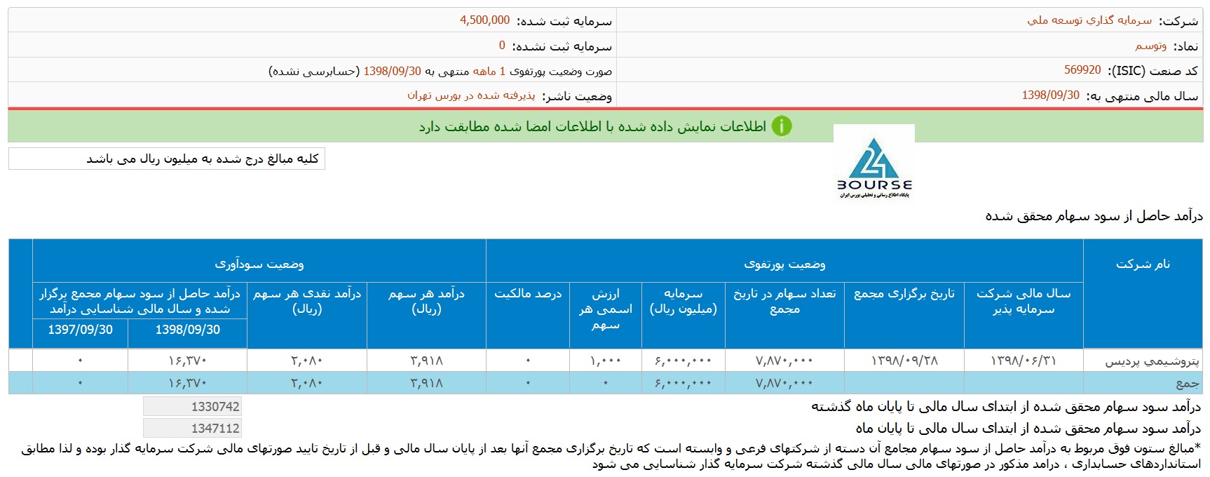 با احتساب سود سرمایه گذاری ها و سایر درآمد های شرکت، بیش از 450 میلیارد تومان درآمد در 12 ماهه سال مالی نصیب شرکت شده است.