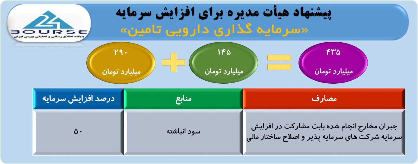 به گزارش کدال نگر بورس ٢۴، هیأت مدیره سرمایه گذاری دارویی تامین افزایش سرمایه ۵٠ درصدی این شرکت از محل سود انباشته را به تصویب رساند.