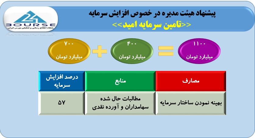 به گزارش کدال نگر بورس٢۴،هیئت مدیره تامین سرمایه امید افزایش سرمایه ۵٧ درصدی این شرکت از محل مطالبات حال شده و آورده نقدی سهامداران را به تصویب رساند.