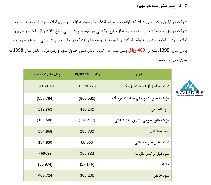 به گزارش کدال نگر بورس ٢۴،شرکت لیزینگ ایرانیان در گزارش تفسیری درآمد حاصل از عملیات لیزینگ را حدود ١۴٢ میلیارد تومان و سود هر سهم را ۴٠ تومان برای سال ٩٨ پیش بینی نموده است.