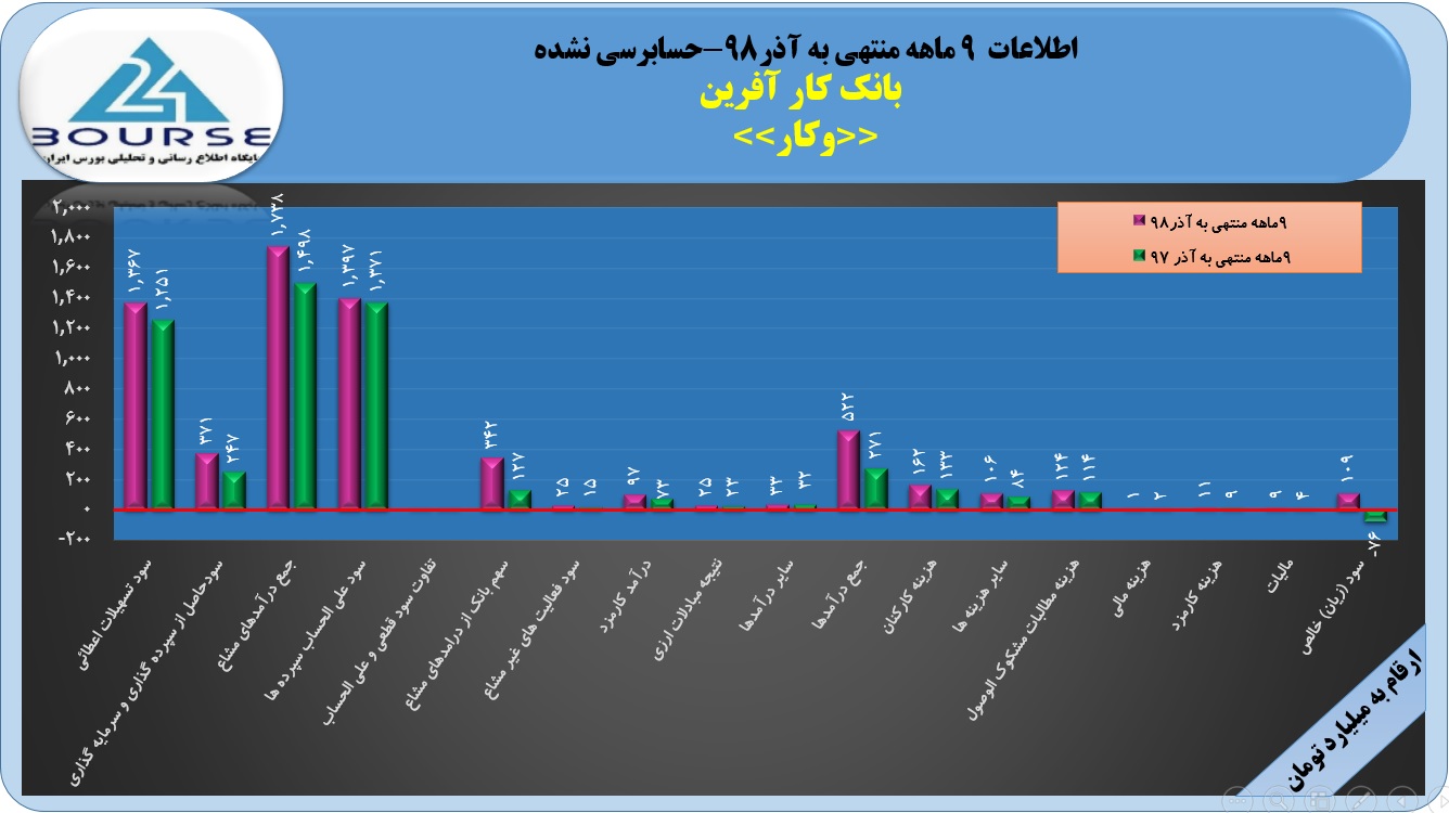 به گزارش کدال نگر بورس٢۴،بانک کار آفرین در ٩ماهه منتهی به آذر ١٣٩٨ مبلغ ١٢٨ ریال به ازای هر سهم سود محقق کرده است که دوره مشابه قبلی ٩٠ ریال زیان بود.در این دوره سود حاصل از تسهیلات اعطایی ٩ درصد رشد داشته است.