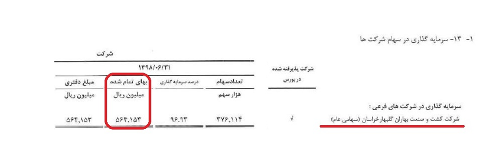نکته جالب توجه در گزارش های حسابرسی شرکت شهداب، بهای تمام شده هر سهم غبهار برای این شرکت است. با توجه به این گزارش ها، بهای تمام شده هر سهم غبهار، تنها 150 تومان است. به عبارت ساده تر، شرکت شهداب، هر سهم شرکت بهاران گلبهار را به قیمت 150 تومان به مالکیت خود درآورده است که در مجموع مبلغی حدود 56 میلیارد تومان است و در تصویر زیر قابل مشاهده است. لازم به ذکر است تصویر زیر مربوط به گزارش حسابرسی انتهای شهریور 98 است و در حال حاضر شرکت مالکیت 9/93 درصد غبهار را در اختیار دارد.