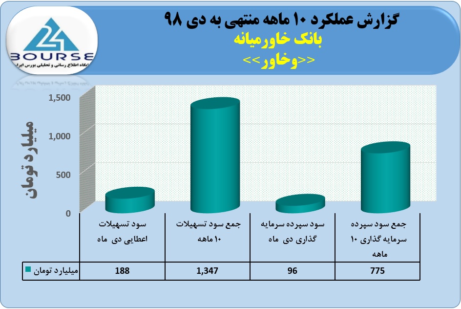 به گزارش کدال نگر بورس ٢۴، بانک خاورمیانه در عملکرد ١٠ ماهه منتهی به دی ١٣٩٨، حدود ١٣۴٧ میلیارد تومان درآمد از تسهیلات اعطایی خود کسب نمود که ١٨٨ میلیارد تومان از این درآمد در همین ماه حاصل شده است. هم چنین جمع سود اعطا شده به سپرده های سرمایه گذاری شده در این بانک به ٧٧۵ میلیارد تومان رسید که حدود ٩۶ میلیارد تومان آن مربوط به ماه دی می باشد. گفتنی است تراز این بانک در مدت ١٠ ماهه ۵٧١ میلیارد تومان و دی ماه ٩١ میلیارد تومان مثبت بود.