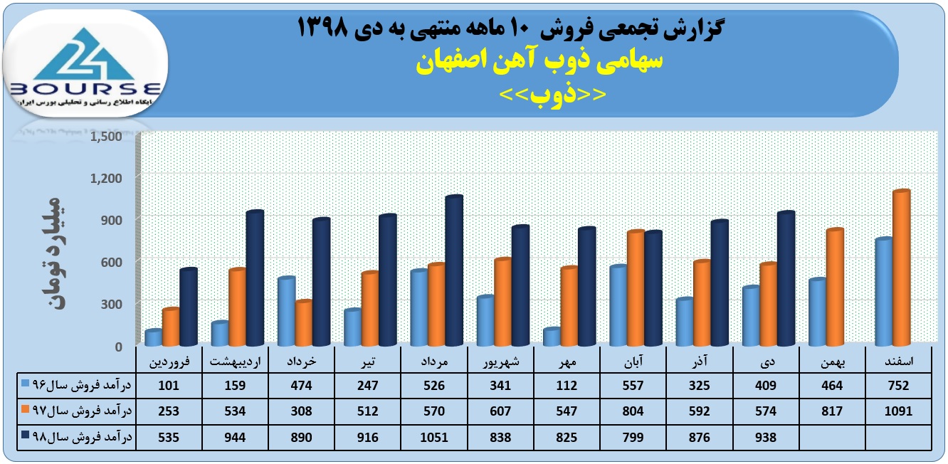 به گزارش کدال نگر بورس ٢۴،فروش شرکت سهامی ذوب آهن اصفهان در ١٠ماهه منتهی به دی ١٣٩٨ با افزایش چشمگیر نسبت به دوره مشابه قبل به ٨۶١٢ میلیارد تومان رسید.