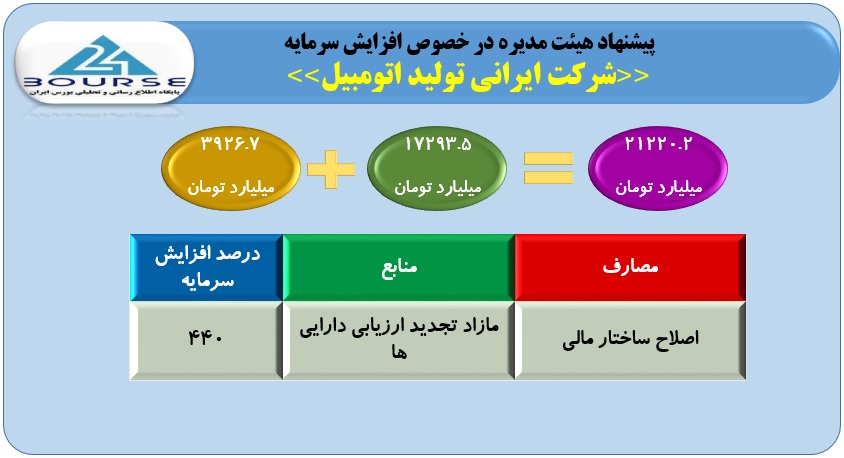 به گزارش کدال نگر بورس ٢۴،هیئت مدیره شرکت ایرانی تولید اتومبیل افزایش سرمایه سنگین ۴۴٠درصدی از محل مازاد تجدید ارزیابی دارایی ها را به تصویب رساند.