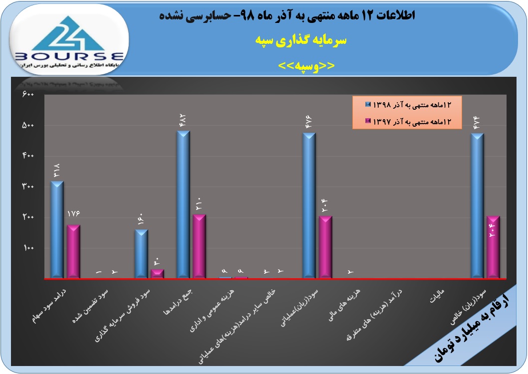 به گزارش کدال نگر بورس ٢۴،شرکت سرمایه گذاری سپه در ١٢ ماهه منتهی به آذر ١٣٩٨ مبلغ ٧٠٩ ریال به ازای هرسهم سود محقق کرده است که ١٣٢ درصد نسبت به دوره مشابه قبلی رشد داشته است.جمع درآمد های عملیاتی در این دوره ١٣٠ درصد نسبت به دوره مشابه قبل رشد داشته است.