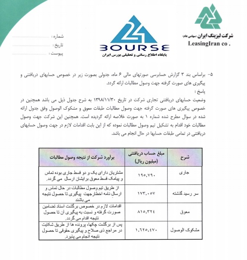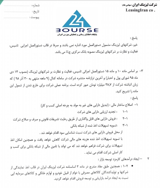 به گزارش کدال نگر بورس ٢۴،شرکت لیزینگ ایران به سوالات مطرح شده در سامانه تدان پاسخ داد.