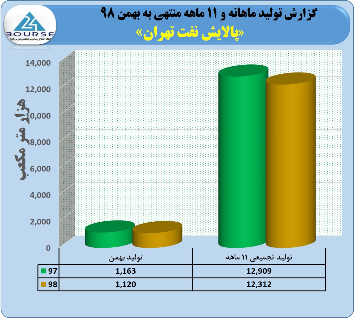 به گزارش کدال نگر بورس ٢۴ شرکت پالایش نفت تهران در ١١ ماهه منتهی به بهمن ١٣٩٨ حدود ١٢٣١٢ هزار متر مکعب تولید داشت که از این مقدار حدود ١١٢٠ هزار مترمکعب در همین ماه تولید شده است.