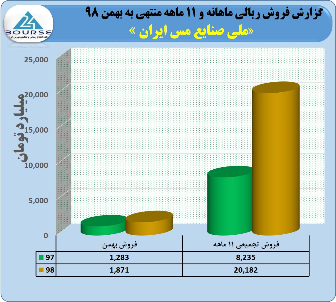 به گزارش کدال نگر بورس ٢۴ شرکت ملی صنایع مس ایران در ١١ ماهه منتهی به بهمن ١٣٩٨ از فروش محصولات خود ٢٠١٨٢ میلیارد تومان درآمد کسب نمود که حدود ١٨٧١ میلیارد تومان آن مربوط به فروش بهمن ماه می باشد. گفتنی است مبلغ فروش این شرکت در مدت ١١ ماهه سال ٩٨ در مقایسه با مدت مشابه سال قبل ١۴۵ درصد رشد داشته است.