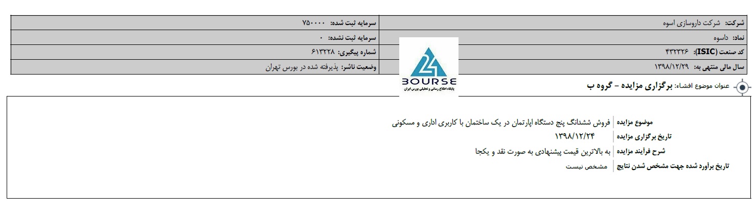 به گزارش کدال نگر بورس ٢۴، شرکت داروسازی اسوه اعلام نمود در نظر دارد ششدانگ پنج دستگاه اپارتمان در یک ساختمان با کاربری اداری و مسکونی را از طریق مزایده به فروش برساند.