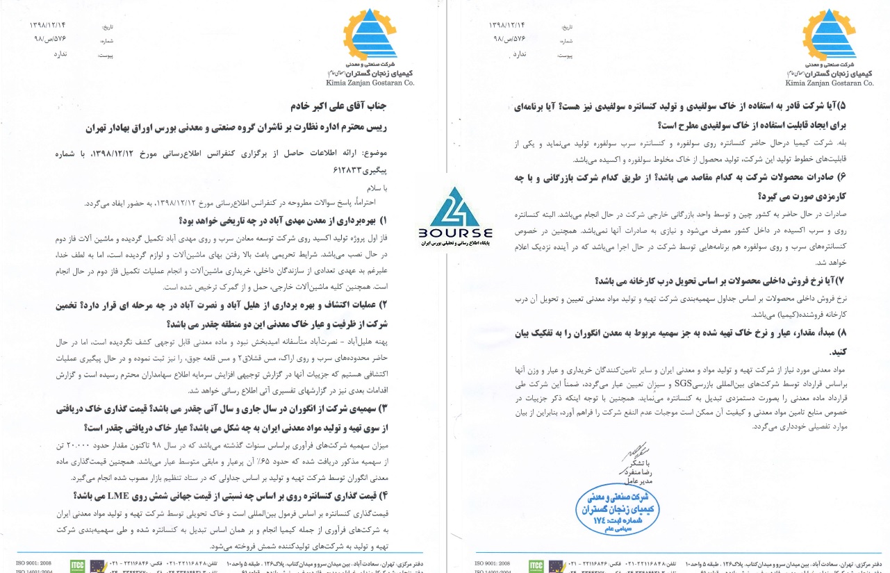 به گزارش کدال نگر بورس ٢۴، شرکت صنعتی و معدنی کیمیای زنجان گستران اهم مطالب مربوط به کنفرانس اطلاع رسانی را منتشر نمود.