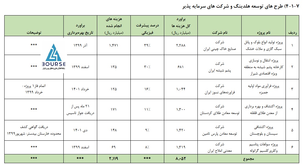 به گزارش کدال نگر بورس ٢۴،شرکت سرمایه گذاری صدر تامین در گزارش تفسیری اعلام نمود،پروژه فرآوری مواد اولیه جمبزه شرکت فرآورده های نسوز ایران فاز ١ آن در خرداد ٩٩ به اتمام خواهد رسید.گفتنی است پروژه اکتشافی سیستان و بلوچستان شرکت توسعه معادن پارس تامین ،پروژه تولید انواع بلوک و پانل سبک گازی و ملات خشک شرکت صنایع خاک چینی ایران،پروژه سولفات پتاسیم و کلرور کلسیم گرانوله شرکت معدنی املاح ایران،پروژه انتقال و نوسازی کارخانه پشم شیشه به منطقه ویژه اقتصادی شیراز شرکت پشم شیشه ایران،از مهمترین طرح های توسعه هلدینگ و شرکت های سرمایه پذیر می باشد.