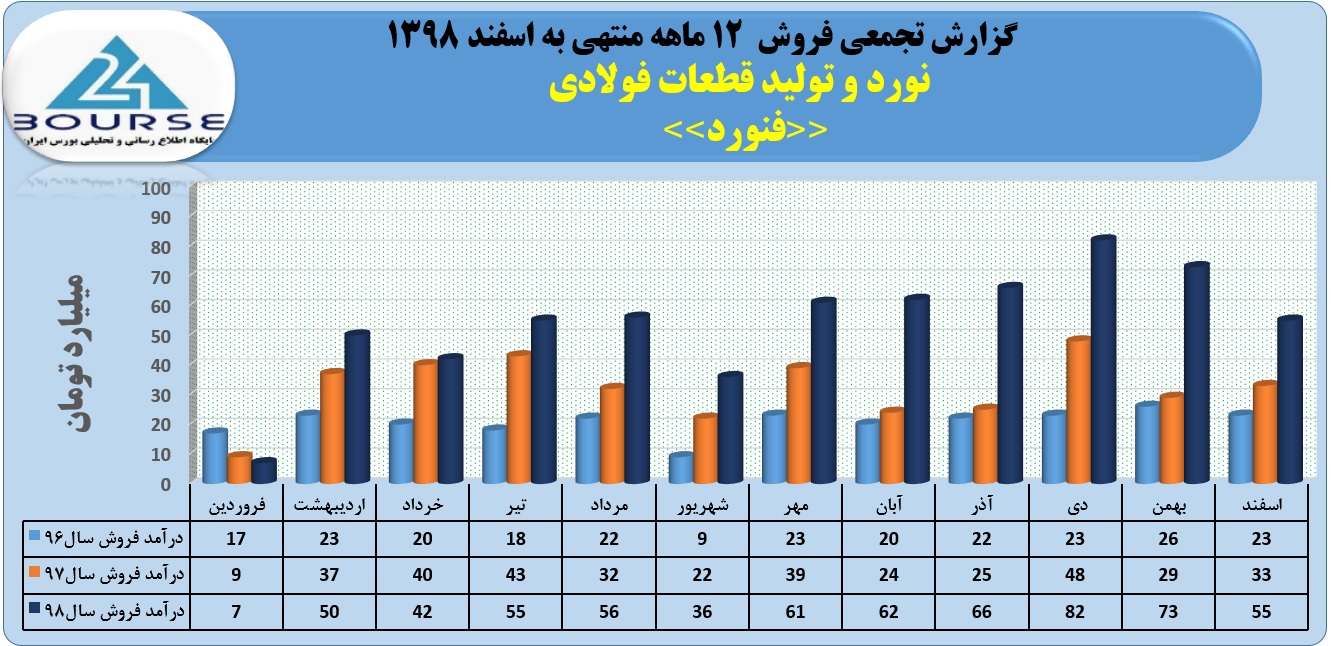 به گزارش کدال نگر بورس ٢۴،شرکت نورد و تولید قطعات فولادی در ١٢ ماهه منتهی به اسفند ١٣٩٨ حدود ۶۴۴ میلیارد تومان از فروش محصولات خود درآمد داشت که حدود ۵۵ میلیارد تومان مربوط به فروش اسفند می باشد.