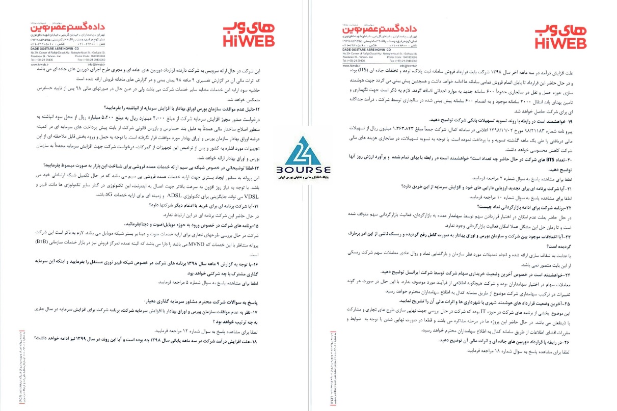 به گزارش کدال نگر بورس ٢۴، شرکت داده گستر عصر نوین در پی نوسان قیمت سهام به برگزاری کنفرانس اطلاع رسانی پرداخت و به سوالات مربوط به برنامه افزایش سرمایه از محل تجدید ارزیابی دارایی ها، همکاری با شرکت ایرانسل و سایر پرسش های مربوط به عملکرد و برنامه های آتی شرکت پاسخ داد.