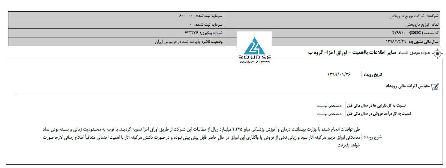 به گزارش کدال نگر بورس ٢۴، شرکت توزیع داروپخش اعلام نمود طی توافقات انجام شده با وزارت بهداشت درمان و آموزش پزشکی مبلغ ٢.٢٢۵ میلیارد ریال از مطالبات این شرکت از طریق اوراق اخزا تسویه گردید. با توجه به محدودیت زمانی و بسته بودن نماد معاملاتی اوراق مزبور هرگونه آثار سود و زیانی ناشی از فروش یا واگذاری این اوراق در حال حاضر قابل پیش بینی نبوده و در صورت داشتن هرگونه آثار با اهمیت احتمالی متعاقباً اطلاع رسانی لازم، صورت خواهد پذیرفت.