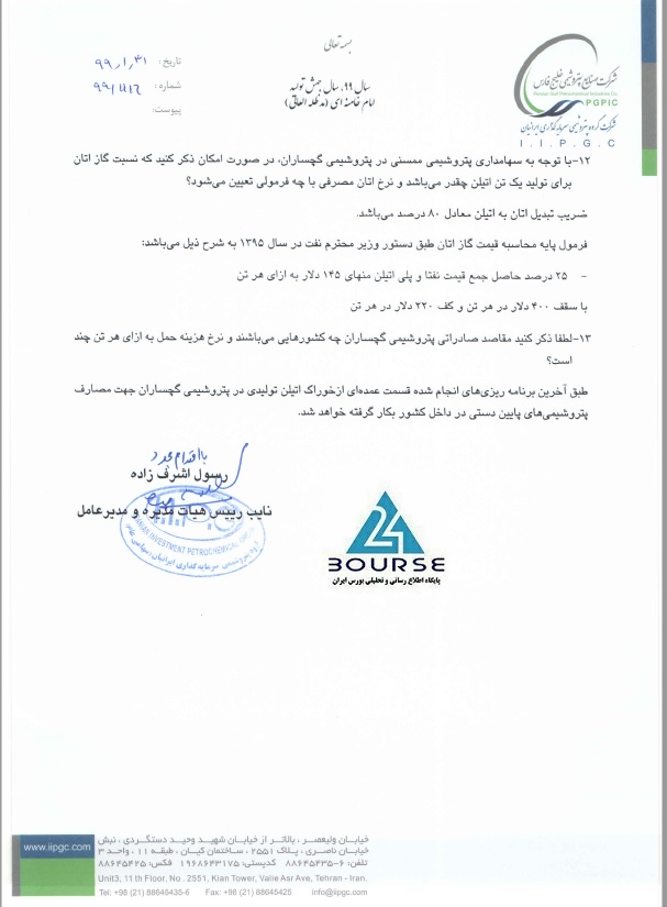 به گزارش کدال نگر بورس ٢۴، شرکت گروه پتروشیمی سرمایه گذاری ایرانیان پاسخ سوالات مربوط به ارزش روز دارایی های شرکت، عرضه شرکت های غیر بورسی، وضعیت پروژه های شرکت و ... پاسخ داد.