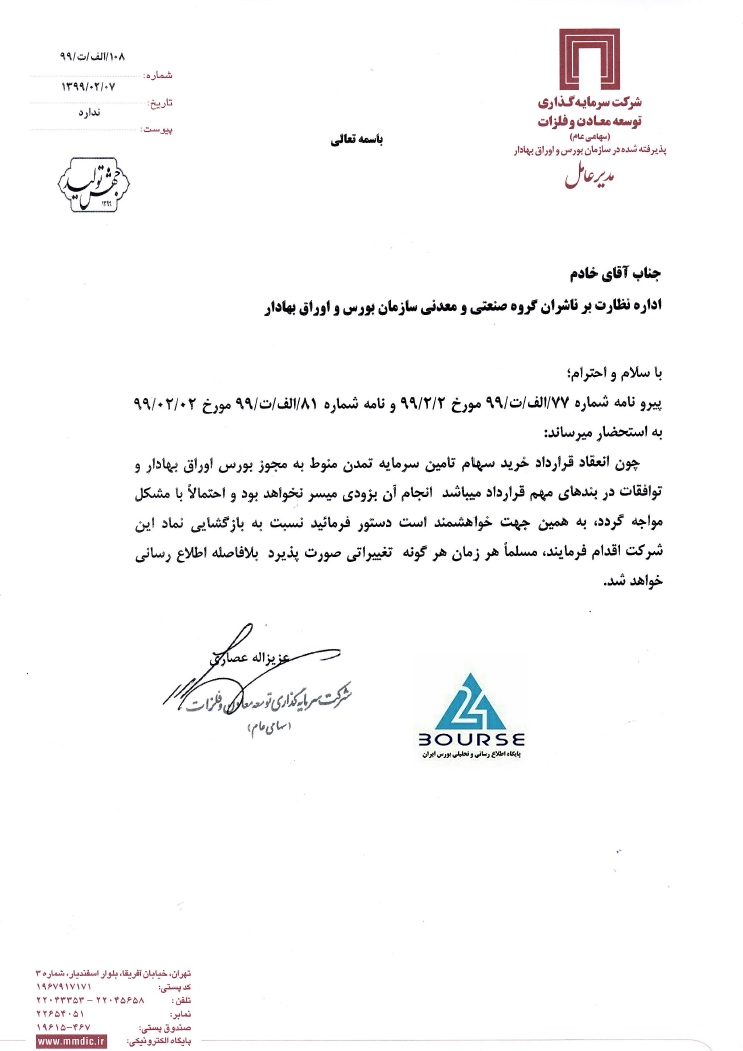 به گزارش کدال نگر بورس ٢۴، شرکت سرمایه گذاری توسعه معادن و فلزات اعلام نمود خرید سهام تامین سرمایه تمدن منوط به دریافت مجوز بورس اوراق بهادار می باشد انجام آن به زودی میسر نیست.