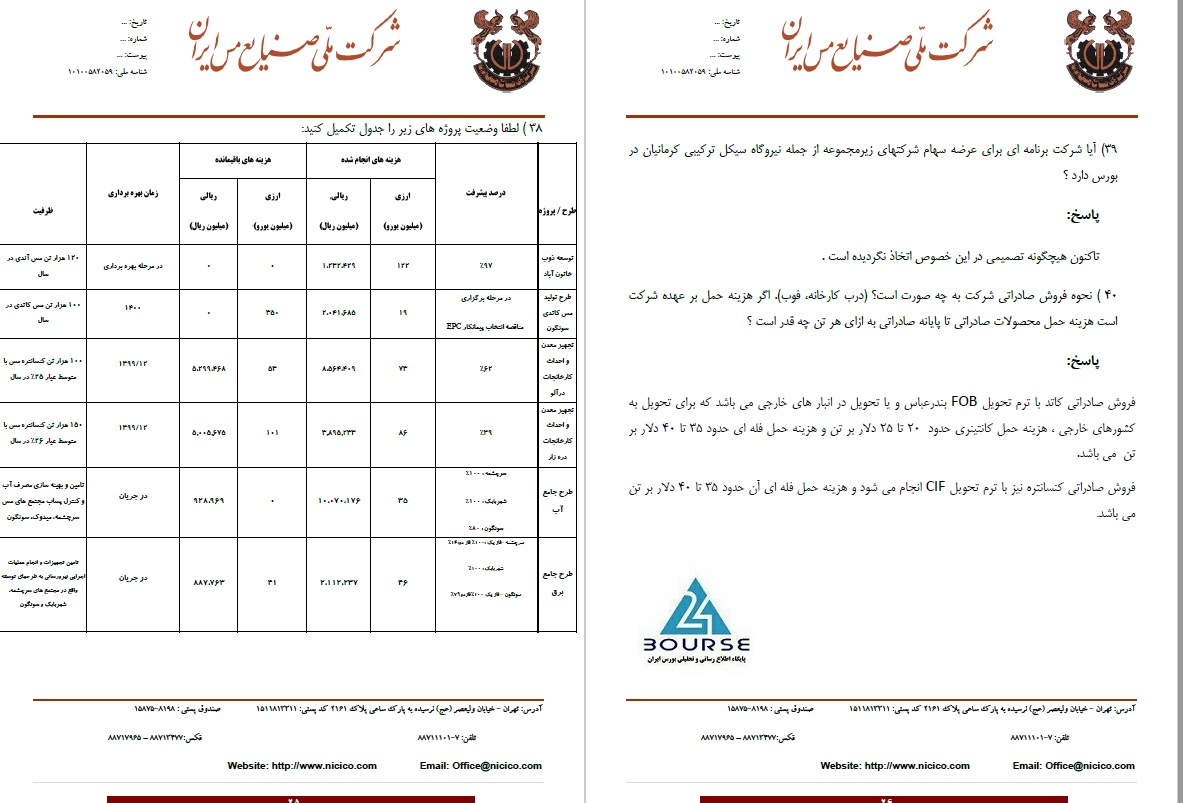 به گزارش کدال نگر بورس ٢۴، شرکت ملی صنایع مس ایران اهم مطالب مطرح شده در کنفرانس خبری را منتشر نمود. این شرکت در خصوص هزینه استخراج هر تن ماده معدنی در سال ٩٨ و پیش بینی آن در سال ٩٩، پیشبینی مقدار تولید محصولات در سال ٩٩ و سود سال آینده و مقاصد فروش صادراتی، درصد پیشرفت طرح های توسعه شرکت، انجام اقدامات مقدماتی در خصوص افزایش سرمایه برای انجام پروژه های توسعه ای، تحلیل شرکت از چشم انداز قیمت جهانی مس و ... توضیح داد.