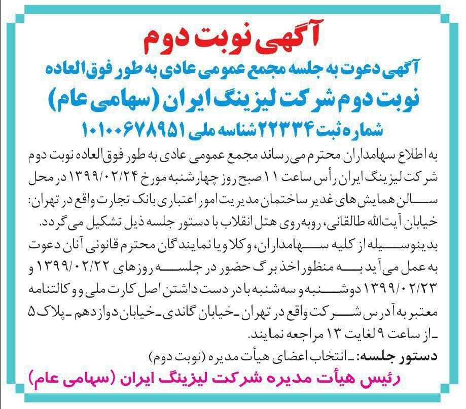 مجمع شرکت لیزینگ ایران به منظور انتخاب اعضای هیات مدیره روز ٢۴ اردیبهشت برگزار خواهد شد.