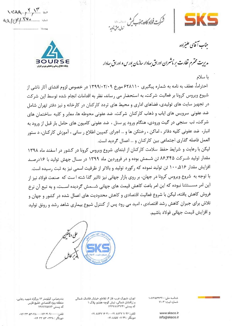 به گزارش کدال نگر بورس ٢۴، شرکت فولاد کاوه جنوب کیش در خصوص تاثیرات شیوع بیماری کورنا بر فعالیت شرکت شفاف سازی نمود.