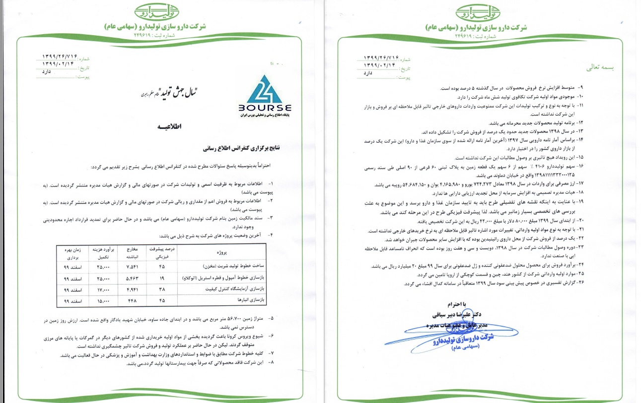 به گزارش کدال نگر بورس ٢۴، شرکت داروسازی تولید دارو اهم مطالب مطرح شده در کنفرانس اطلاع رسانی را منتشر نمود.
