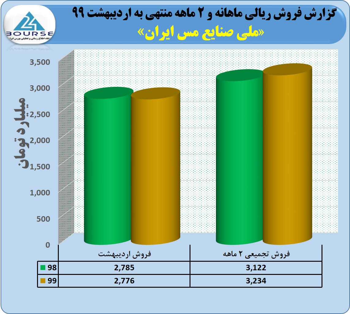 به گزارش کدال نگر بورس ٢۴ شرکت ملی صنایع مس ایران در ٢ ماهه منتهی به اردیبهشت ١٣٩٩ از فروش محصولات خود ٣٢٣۴ میلیارد تومان درآمد کسب نمود که از این مبلغ ٢٧٧۶ میلیارد تومان آن مربوط به همین ماه می باشد. گفتنی است مبلغ فروش این شرکت در مدت ٢ ماهه سال ٩٩ در مقایسه با مدت مشابه سال قبل ۴ درصد رشد داشته است.