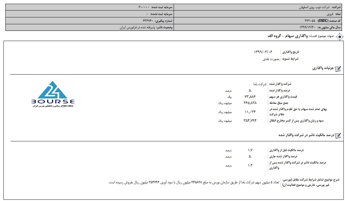 به گزارش کدال نگر بورس ٢۴،شرکت ذوب روی اصفهان ۵میلیون سهم شرکت باما را به مبلغ کل حدود ٣٧ میلیارد تومان فروخته است.سود این معامله حدود ٣۵ میلیارد تومان می باشد.