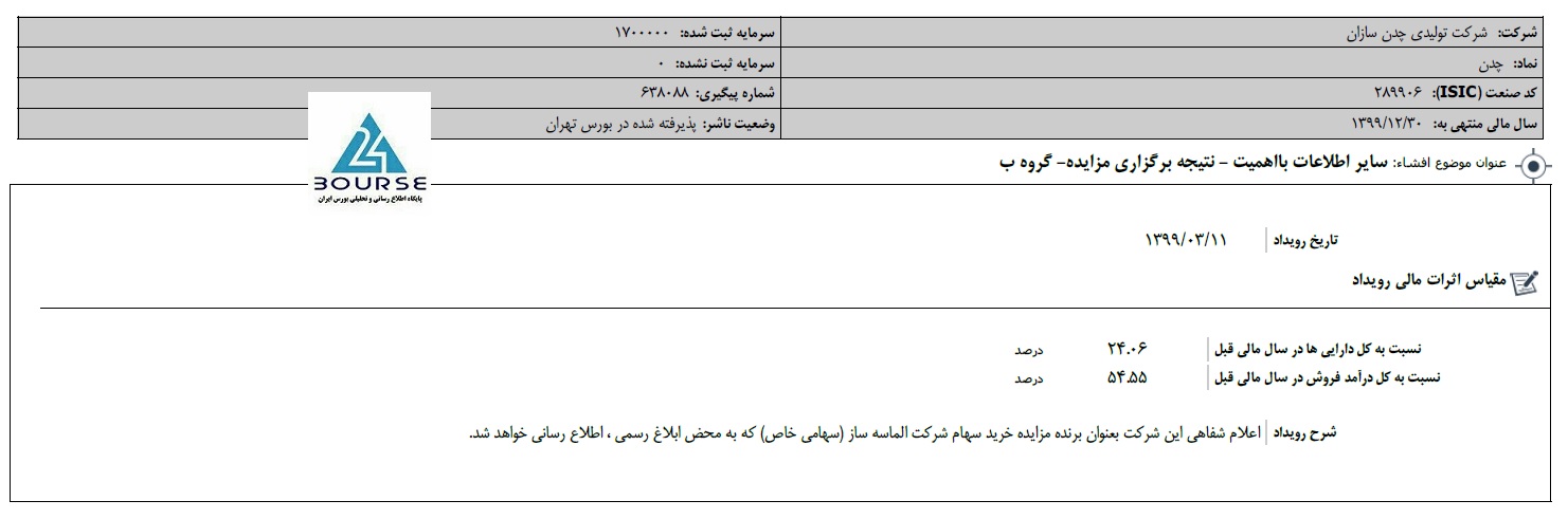 به گزارش کدال نگر بورس ٢۴، شرکت چدن سازان اعلام نمود این شرکت به صورت شفاهی بعنوان برنده مزایده خرید سهام شرکت الماسه ساز (سهامی خاص) معرفی شده که به محض ابلاغ رسمی ، اطلاع رسانی خواهد شد.