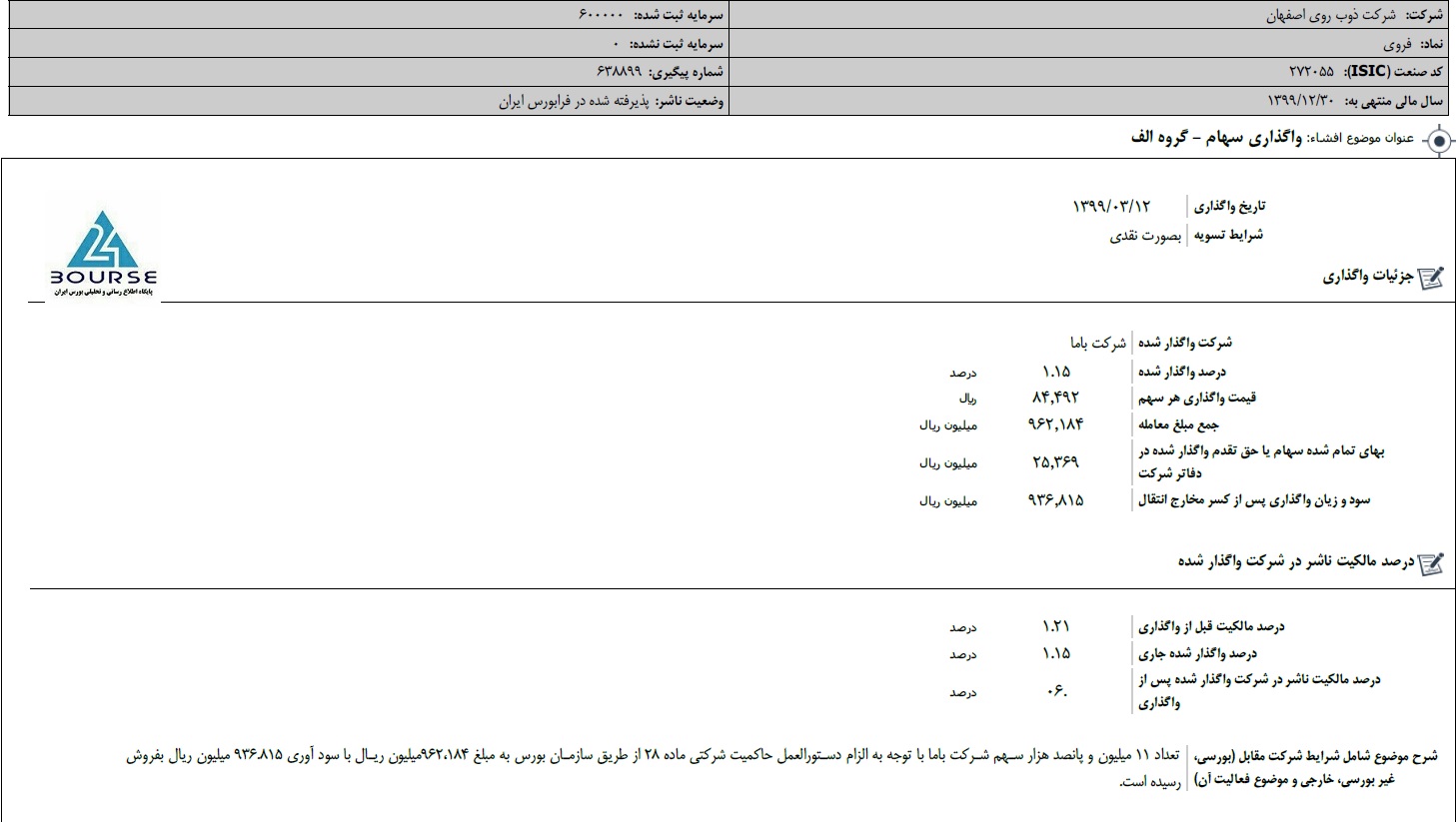به گزارش کدال نگر بورس ٢۴، شرکت ذوب روی اصفهان از فروش تعداد ١١ میلیون و پانصد هزار سهم شرکت باما و کسب سود ٩۴ میلیارد تومانی از این محل خبر داد.