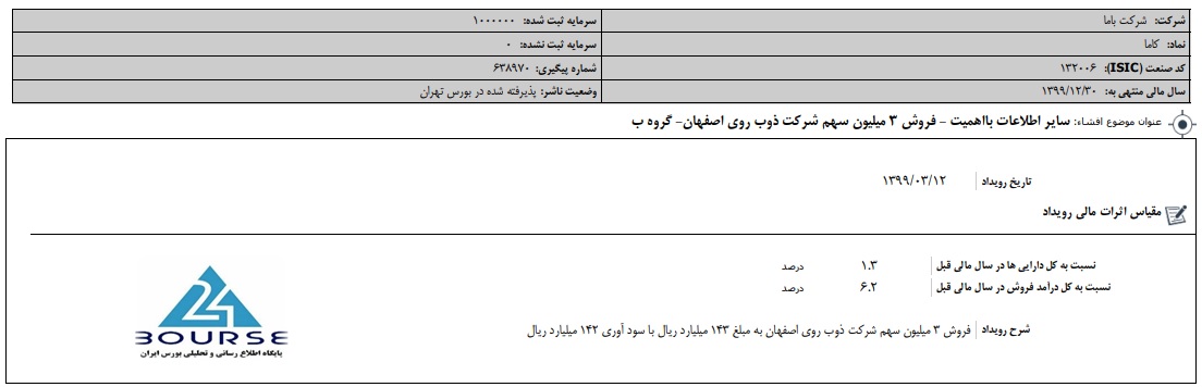 به گزارش کدال نگکر بورس ٢۴،شرکت باما ٣میلیون سهم شرکت ذوب روی اصفهان را به فروش رسانده و حدود ١۴٢ میلیارد ریال از این معامله سود برده است.