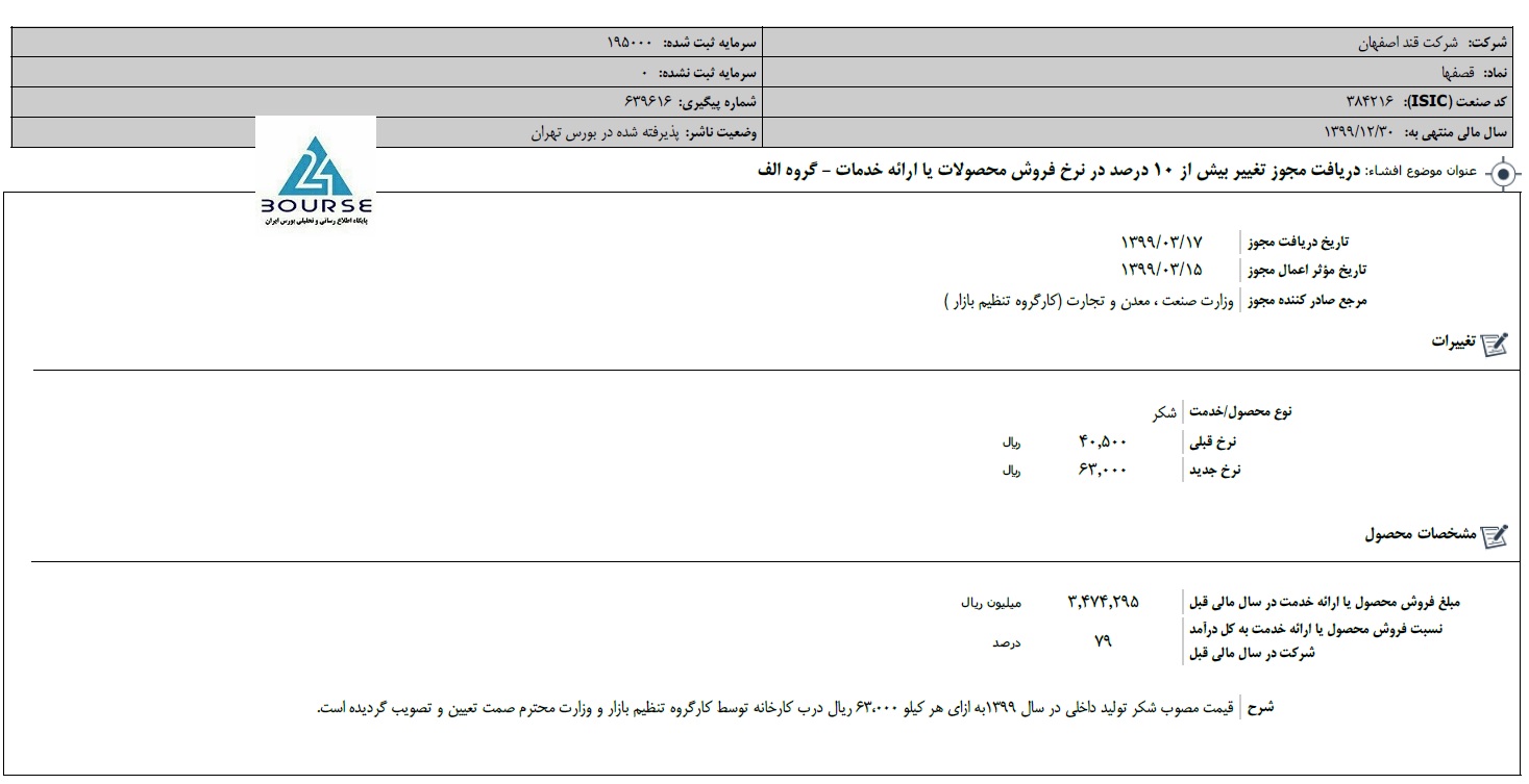 به گزارش کدال نگر بورس ٢۴، شرکت قند اصفهان اعلام نمود قیمت مصوب شکر تولید داخلی در سال ١٣٩٩به ازای هر کیلو ۶٣،٠٠٠ ریال درب کارخانه توسط کارگروه تنظیم بازار و وزارت محترم صمت تعیین و تصویب گردیده است.