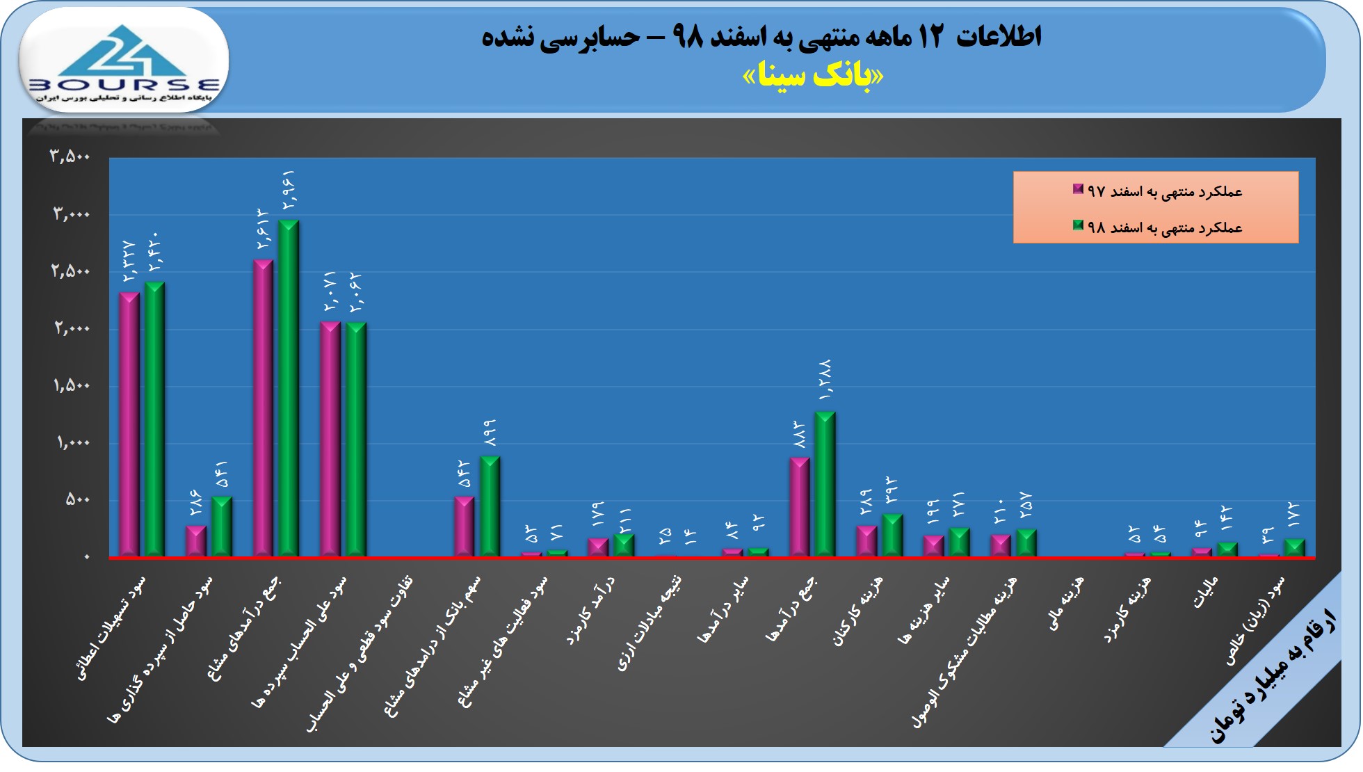 به گزارش کدال نگر بورس ٢۴ بانک سینا در ١٢ ماهه منتهی به اسفند ١٣٩٨ برای هر سهم ١٧٢ ریال سود محقق کرد. وسینا در مدت مشابه سال قبل ٣٩ ریال سود برای هر سهم شناسایی کرده بود. علت اصلی افزایش ٣۴١ درصدی سود بانک در ١٢ ماهه سال ٩٨ نسبت به مدت مشابه قبل را می توان ناشی از رشد ۴۶ درصدی درآمدها دانست. گفتنی است سود تلفیقی محقق شده به ازای هر سهم در سال ٩٨ معادل ٢۶۶ ریال بود.