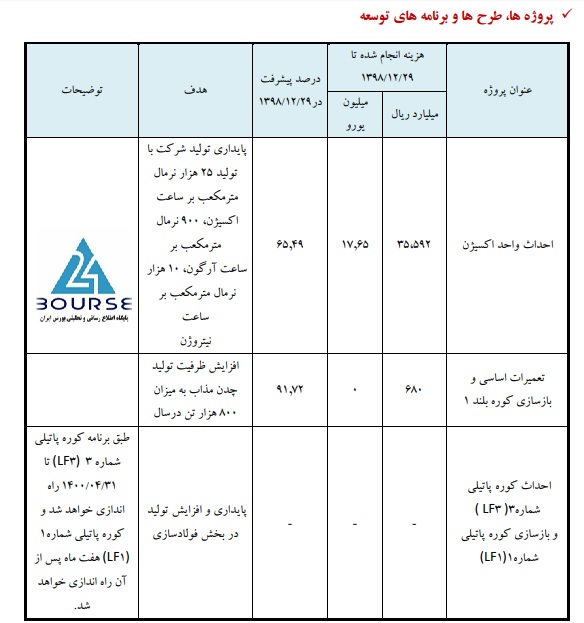 به گزارش کدال نگر بورس ٢۴،شرکت سهامی ذوب آهن اصفهان در گزارش تفسیری اعلام نمود، احداث واحد اکسیژن ،بازسازی کوره بلند،احداث کوره پاتیلی از مهمترین پروژه ها ،طرح ها و برنامه های توسعه شرکت می باشد.