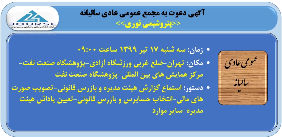 به گزارش کدال نگر بورس ٢۴، شرکت پتروشیمی نوری سهامداران خود را برای شرکت در مجمع عمومی عادی سالیانه در روز سه شنبه ١٧ تیر ماه دعوت کرد.