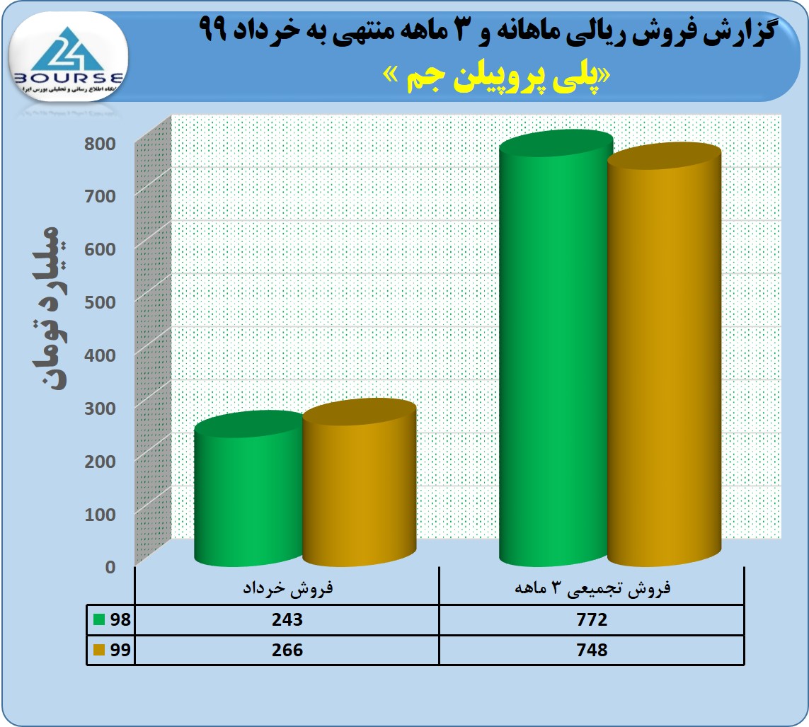 به گزارش کدال نگر بورس ٢۴ شرکت پلی پروپیلن جم در ٣ ماهه منتهی به خرداد ١٣٩٩ از فروش محصولات خود ٧۴٨ میلیارد تومان درآمد کسب نمود که از این مبلغ ٢۶۶ میلیارد تومان آن مربوط به همین ماه می باشد.