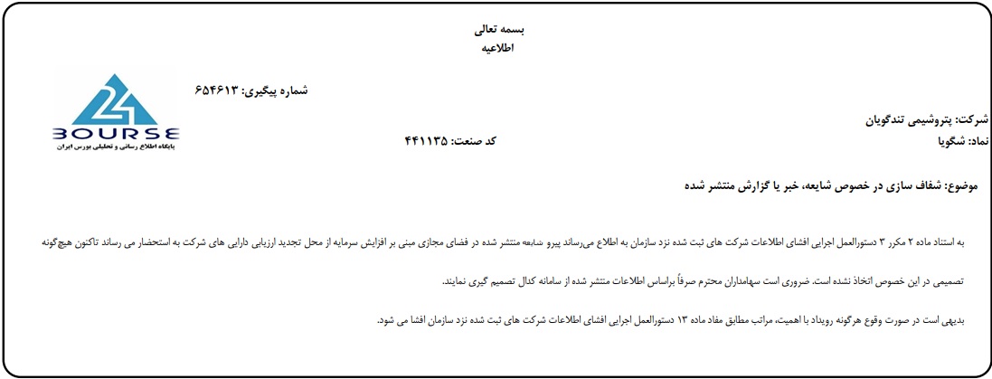 به گزارش کدال نگر بورس ٢۴، پتروشیمی تندگویان اعلام داشت، پیرو شایعه منتشر شده در فضای مجازی مبنی بر افزایش سرمایه از محل تجدید ارزیابی دارایی های شرکت به استحضار می رساند تاکنون هیچ گونه تصمیمی در این خصوص اتخاذ نشده است.