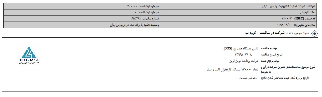 به گزارش کدال نگر بورس ٢۴، شرکت تجارت الکترونیک پارسیان کیش اعلام نمود در مناقصه تامین دستگاه های پوز (pos) شرکت پرداخت نوین آرین شرکت نموده است.