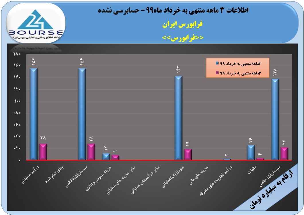 به گزارش کدال نگر بورس ٢۴، شرکت فرابورس ایران در ٣ ماهه منتهی به خرداد ١٣٩٩ مبلغ ۴٩٢ ریال با سرمایه ٢٨٠ میلیارد تومان به ازای هر سهم سود محقق کرده است که ۵٢٠ درصد نسبت به دوره مشابه سال گذشته رشد داشته است. درآمد های عملیاتی در این دوره رشد خوبی داشته و ۴۴٩ درصد و سود عملیاتی ۶۵٨ درصد نسبت به دوره مشابه سال گذشته رشد داشته است.