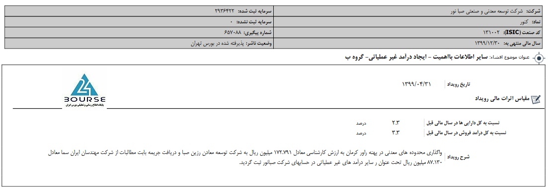 به گزارش کدال نگر بورس ٢۴، شرکت توسعه معدنی و صنعتی صبا نور اعلام نمود واگذاری محدوده های معدنی در پهنه راور کرمان به ارزش کارشناسی معادل ١٧٢.٧٩١ میلیون ریال به شرکت توسعه معادن رزین صبا و دریافت جریمه بابت مطالبات از شرکت مهندسان ایران سما معادل ٨٧.١٣٠ میلیون ریال تحت عنوان سایر درآمد های غیر عملیاتی در حسابهای شرکت صبانور ثبت گردید.