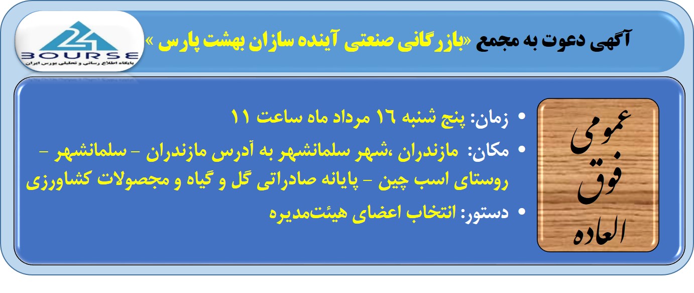 به گزارش کدال نگر بورس ٢۴، شرکت بازرگانی صنعتی آینده سازان بهشت پارس جهت انتخاب اعضای هیئتمدیره مجمع برگزار می کند.