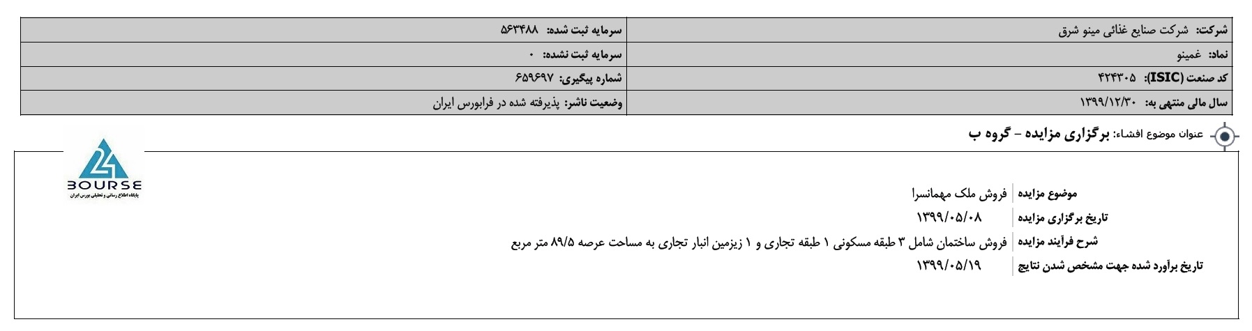 به گزارش کدال نگر بورس ٢۴، شرکت صنایع غذائی مینو شرق اعلام نمود در نظر دارد ملک مهمانسرا را از طریق مزایده عمومی به فروش برساند.