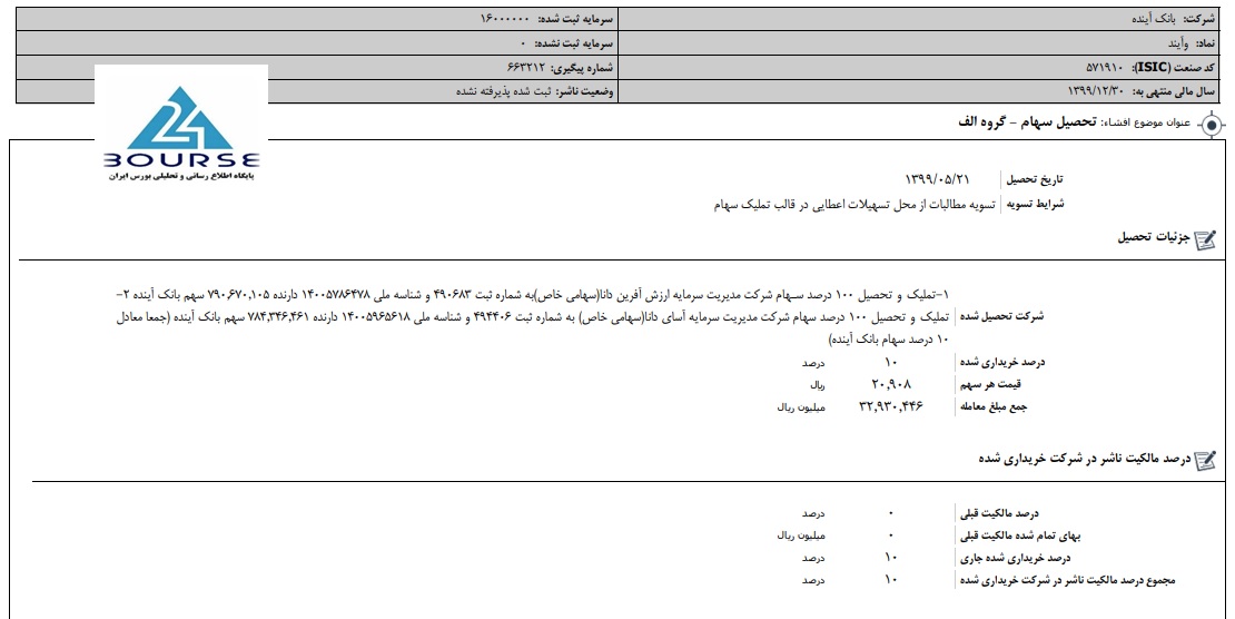 به گزارش کدال نگر بورس ٢۴، بانک آینده از تملیک و تحصیل ١٠٠ درصد سهام شرکت مدیریت سرمایه ارزش آفرین دانا، تملیک و تحصیل ١٠٠ درصد سهام شرکت مدیریت سرمایه آسای دانا خبر داد.مبلغ کل معامله حدود ٣٢٩٣ میلیارد تومان می باشد. شرایط تسویه ، تسویه مطالبات از محل تسهیلات اعطایی در قالب تملیک سهام می باشد.