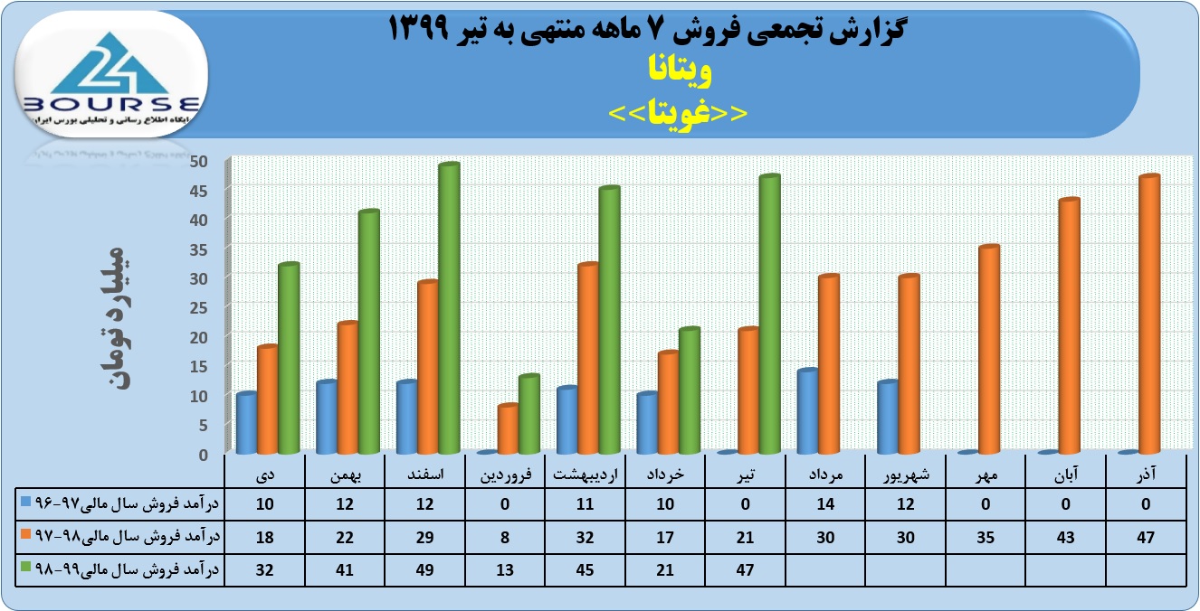 به گزارش کدال نگر بورس ٢۴، شرکت ویتانا در تیر ماه فروش خوبی داشته و بالغ بر ۴٧ میلیارد تومان فروش داشته است.مجموع فروش ٧ ماهه منتهی به تیر ١٣٩٩ حدود ٢۴٩ میلیارد تومان می باشد.
