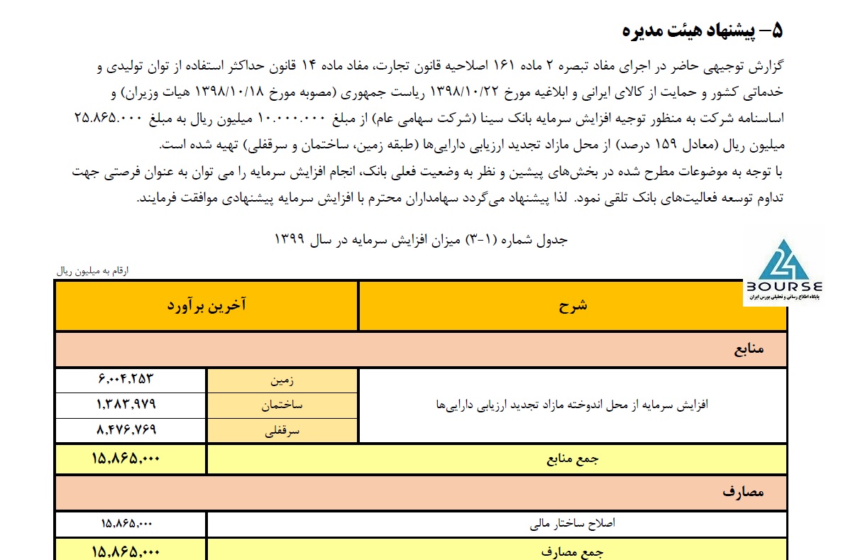 بانک افزایش سرمایه 159 درصدی از تجدید ارزیابی را به تصویب هیئت مدیره رسانده است. این افزایش سرمایه توان جذب منابع و سپرده ها را در بانک افزایش و سبب تسهیلات دهی بیشتر و در نهایت افزایش سود و تراز عملیاتی در بانک سینا خواهد شد.