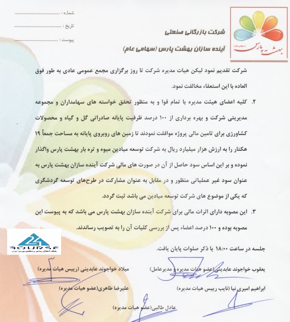 به گزارش کدال نگر بورس ٢۴، شرکت بازرگانی صنعتی آینده سازان بهشت پارس مصوبه هیئت مدیره در خصوص عدم صدور مجوز افزایش سرمایه، استعفای مدیرعامل ، طرح مشارکت برای ایجاد شرکت بین المللی توسعه گردشگری را منتشر نمود.