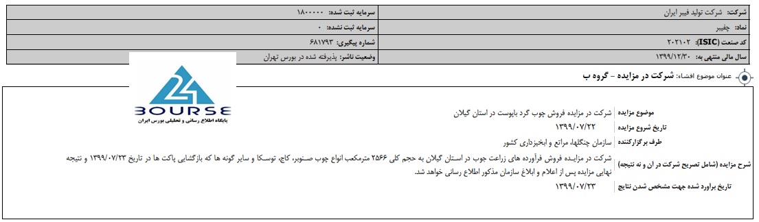 به گزارش کدال نگر بورس ٢۴، شرکت تولید فیبر ایران در مزایده فروش چوب گرد با پوست در استان گیلان شرکت کرده است.